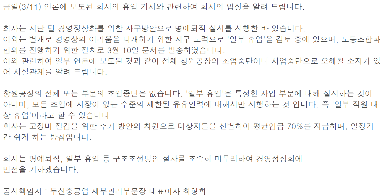 즉 오전에 보도된 뉴스는 확대해석된 뉴스라고 볼 수 있습니다. 휴업하고 일부휴업 엄청 다른 겁니다. 공시내용을 보면 일부 휴업은 특정 사업 부문에서만 시행한다고 되어 있고 아직 하지도 않은 상태입니다. 물론 노조는 반발하겠죠. 하지만 아직 협의조차 되지 않은 상황인데 벌써부터 두산 주가가 크게 폭락하는건 주주들이 묻지마 수준으로 매도한게 아닐까? 싶습니다.