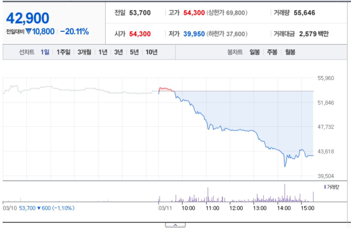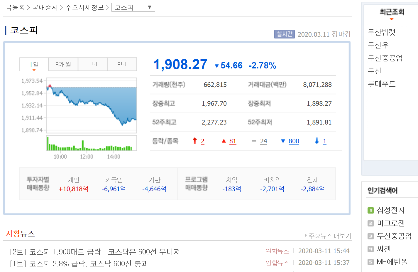 만약 두산그룹주가 크게 폭락하지 않았다면 한국코스피 하락폭도 이렇게까지 크진 않았을거라 봅니다. 오늘 코스피하락은 코로나19로 인한 팬데믹으로 인한 우려도 있지만 두산그룹주폭락이 코스피지수도 끌어내리지 않았나 싶네요.