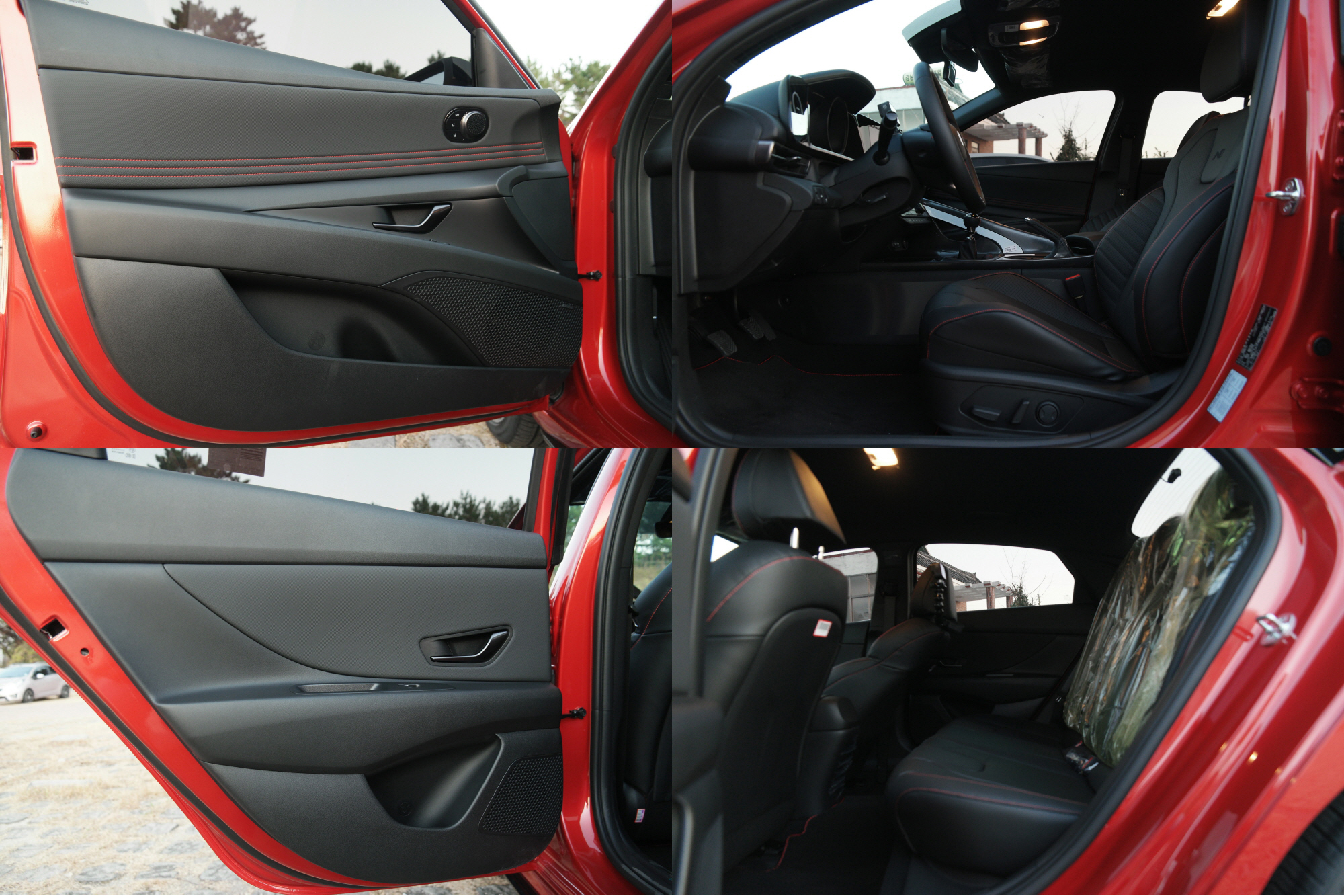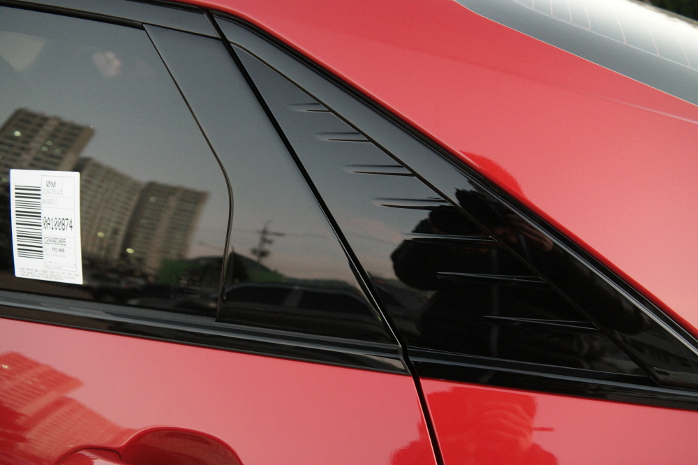 엔라인만의 차별화된 부분 바로 B C 필러쪽 도어 마감재가 블랙유광이라는 점입니다. 노멀이나 하이브리드모델은 무광 플라스틱 재질입니다.