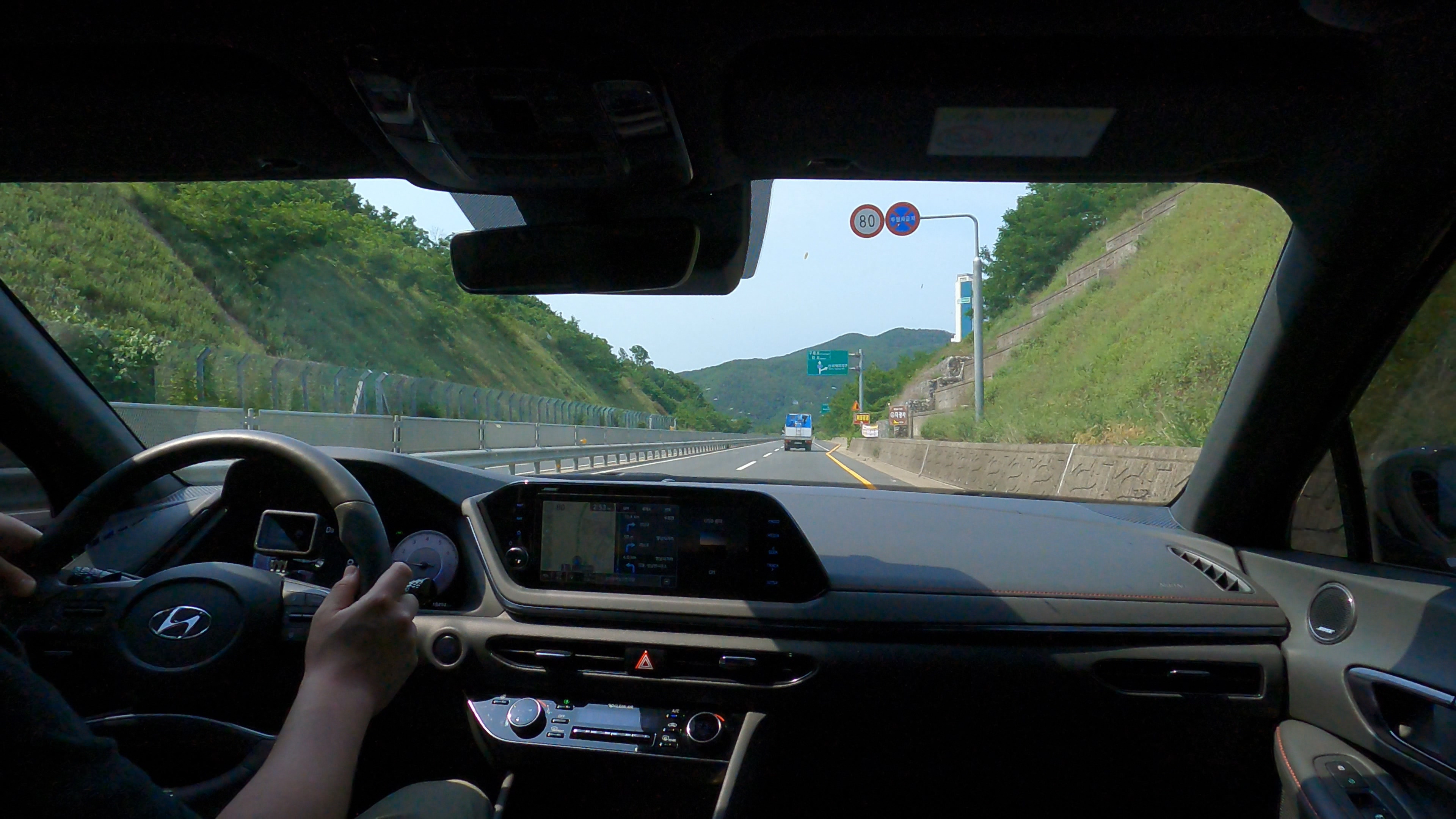 참고로 시승차는 전면유리가 자외선 차단 기능이 있는데요. 제차는 자외선 차단 기능이 없습니다. 두 차량 모두 전면유리가 썬팅시공이 되어 있지 않아서 맑은날에 운전하면서 비교해 봤는데 큰 차이 없지만 확실히 자외선 차단 유리가 있는 쏘나타 N 라인 쪽에 눈이 상대적으로 더 편안했습니다.