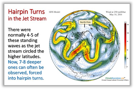 제트기류는 너무 빨라도 문제고 너무 느려도 문제인데 지금의 기상 이변은 제트기류 속도가 너무 느려서 문제다. 제트기류가 느려지면 고기압과 저기압이 정체되는데 특히 지금과 같은 여름철의 경우 정체된 고기압에 있는 지역은 폭염이 발생하기 쉽고 저기압 지역은 반대로 비가 그칠줄 모르고 내린다.