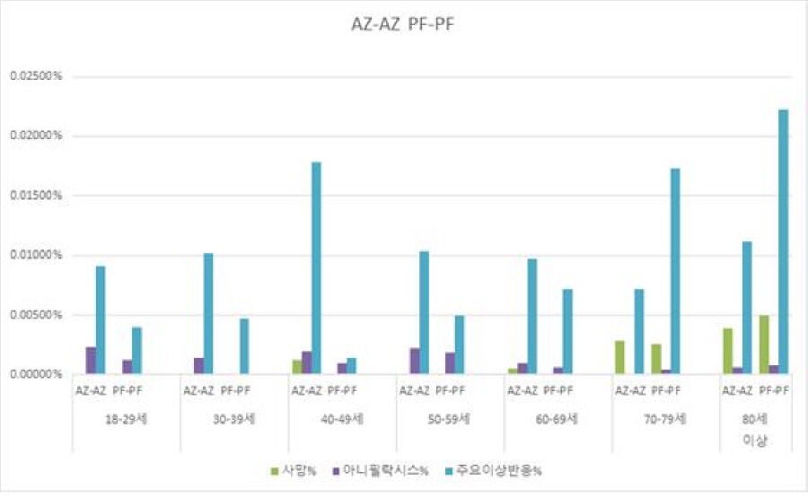 아래 도표는 대한의사협회가 보도자료로 발표한 연령층에 따른 부작용 발생 비율입니다. 화이자와 아스트라제네카를 비교한 건데 화이자는 70세 이상 연령에서 부작용이 높았고 아스트라제네카는 69세 이하에서 부작용 발생률이 높았습니다.