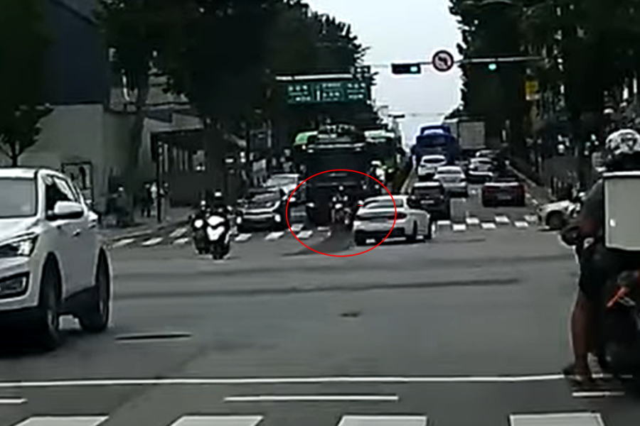그리고 사고 직전 장면입니다. 이 장면보고 많은 사람들이 꼬리물기한 BMW 때문에 오토바이가 출발을 못해서 사고났다고 주장하고 있는데요. 제 생각은 조금 다릅니다. 해당 영상을 반복해서 본 결과 꼬리물기 BMW를 피해 얼마든지 직진할 수 있었다고 봅니다. 그래서 꼬리물기한 BMW에게 교통사고 과실 물기는 어렵다고 봅니다.