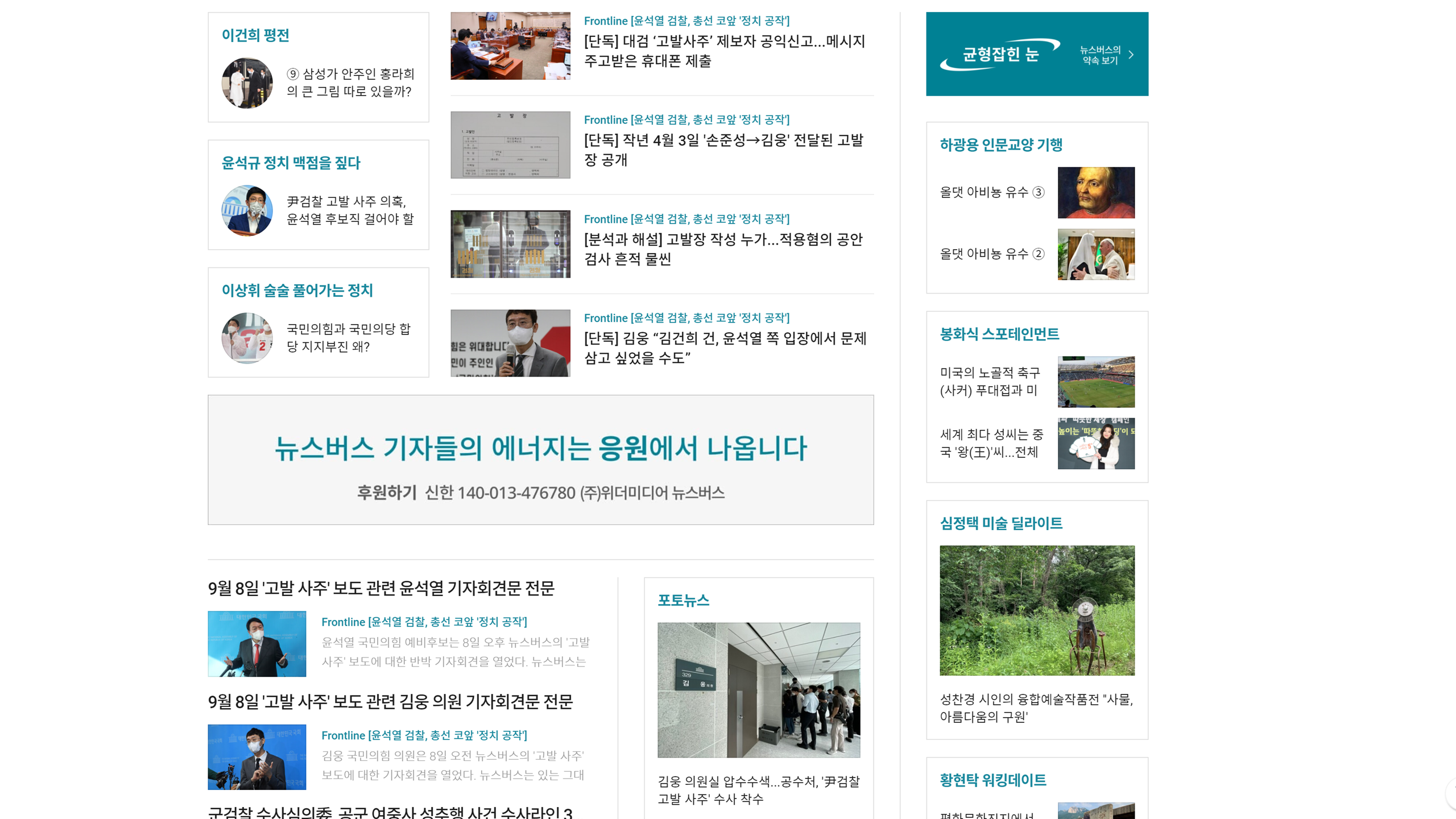 메인홈페이지 하단입니다. 정치·시사 매체라 그런지 최근 이슈가 되는 윤석열 예비후보 기사가 많네요.