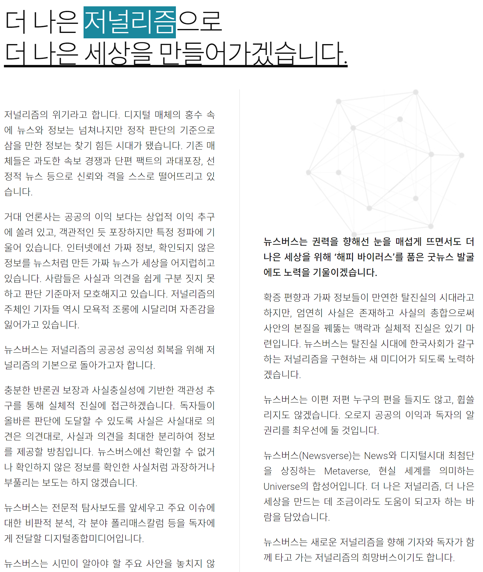 뉴스버스의 매체소개란입니다. '더 나은 저널리즘으로 더 나은 세상을 만들겠습니다' 라는 제목과 함께 매체소개서를 길게 작성했네요.