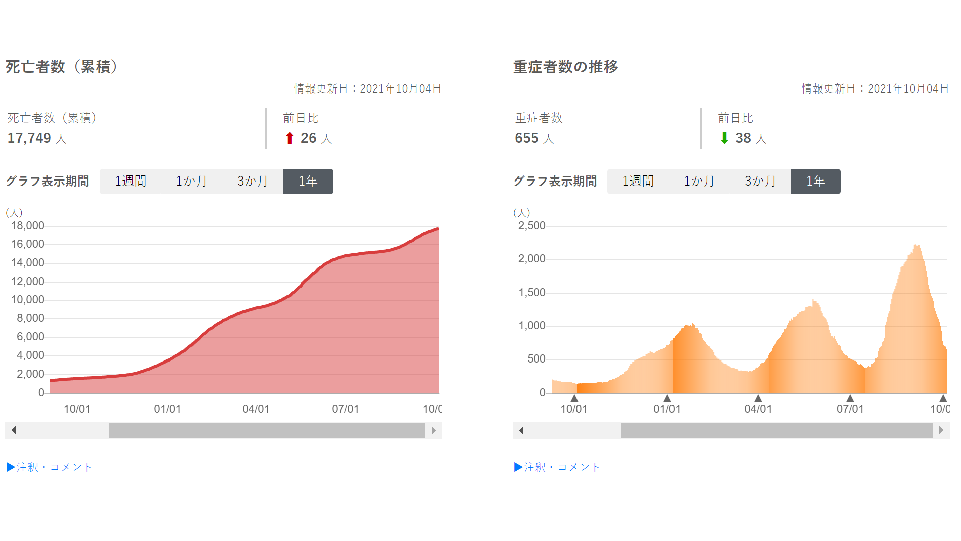 다만 코로나19로 인한 신규사망자수는 26명이나 되네요. 사망자수를 보면 뭔가 감이 오죠? 우리나라의 10월 5일 하루 확진자수는 1,575명인데 코로나19로 인한 사망자수는 11명으로 일본의 절반 미만입니다.