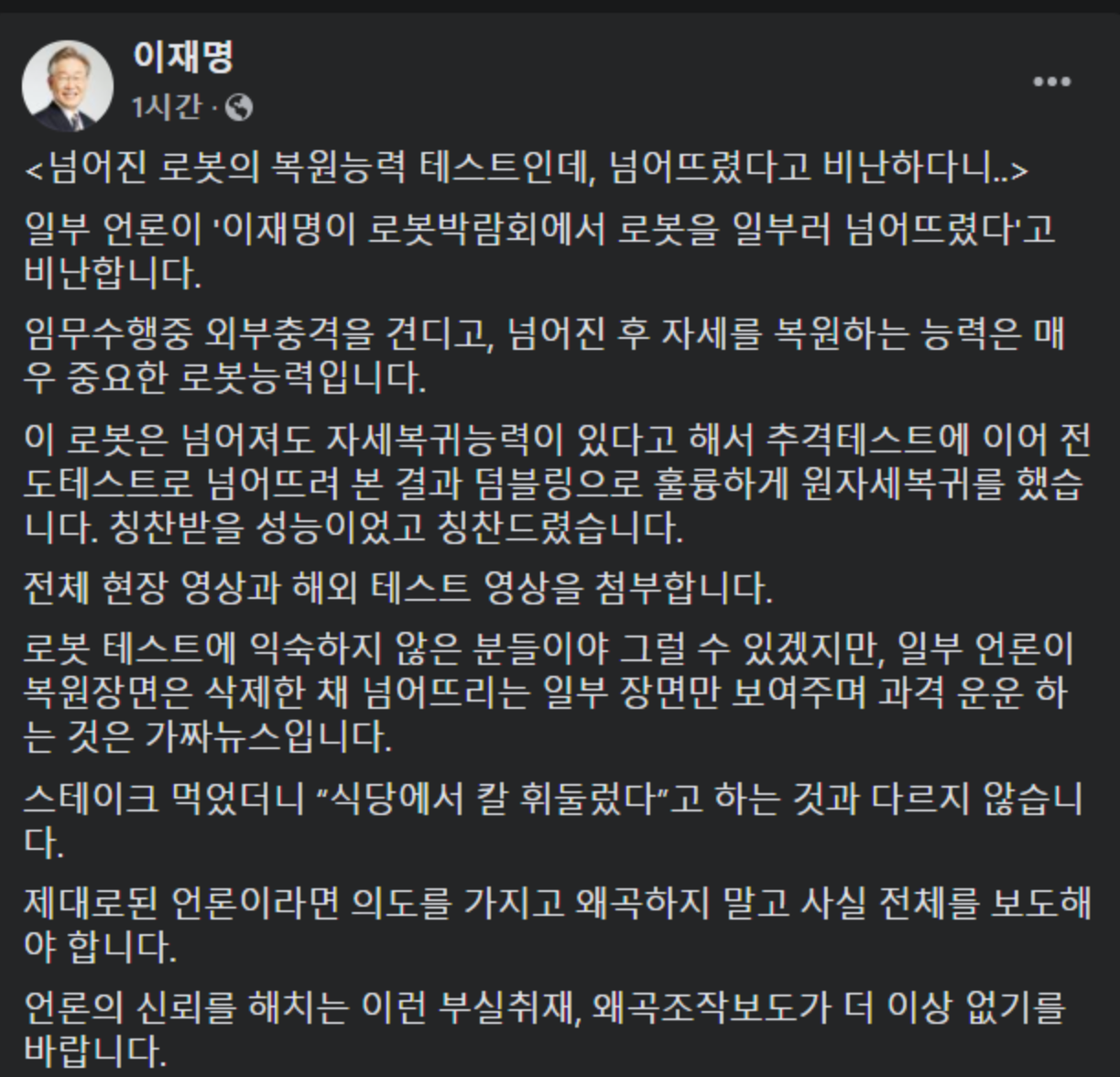 로봇 다루는게 거칠다고 이재명 까는데 로봇은 목적에 따라 시연행사에서 거칠게 다뤄야 할 때도 있다. 그래서 거칠게 다룰 때는 거칠게 다루는게 맞다.