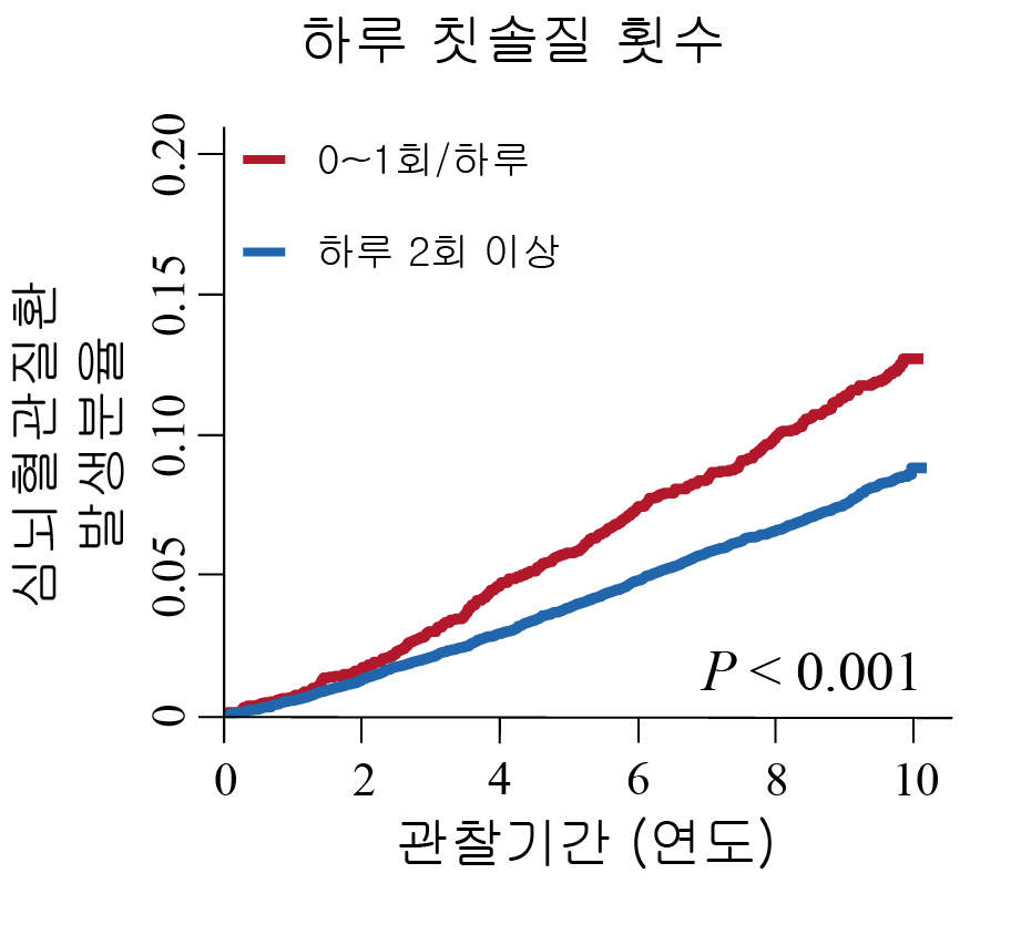 또한, 하루에 칫솔질을 2회 이상 수행한 환자들은 하루 1회 이하 수행한 환자들에 비해 심뇌혈관질환 조정 위험비가 0.79로 위험도가 월등히 낮았으며, 치아가 여러 개 빠졌거나 충치가 많은 경우에도 상대적으로 심뇌혈관질환 위험도가 높다고 하네요.