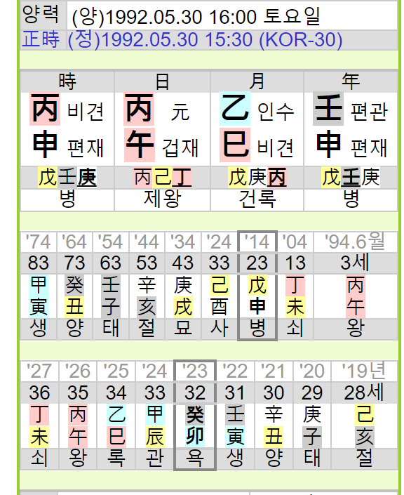 실명 언급하면 개인정보보호법 위반에 걸릴 수 있으니 실명은 언급하진 않겠다. 돌려차기 범인은 1992년 5월 30일생(양력) 남성이다. 태어난 시간은 당연히 모르니 삼주로 추정해본다. 아래 만세력 중 시간은 무시하자.