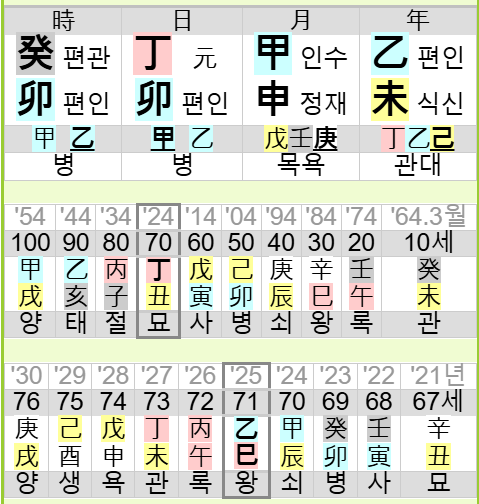 이 사주는 화기운을 둘러싼 목기운이 많아 좋을 거 같지만 시주 천간에 계수가 나와 충돌한다. 그리고 지지의 신금과 묘목이 귀문관살이 발현하는데 이로 인해 오히려 나의 기운이 약해진다.