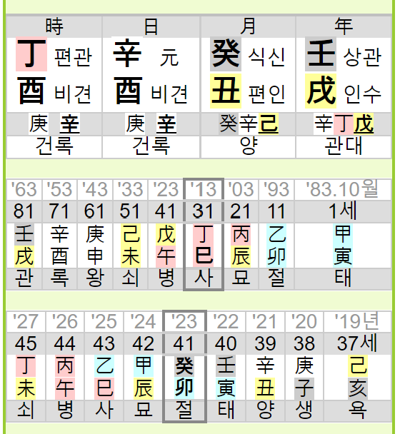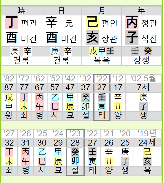 문득 이번 사건을 뉴스로 접하면서 이 가해자가 어떤 사주인지 궁금했다. 다만 정확한 생년월일을 알 수 없는데 이 여교사가 처음부터 정신질환이 있었던 건 아니라고 생각된다. 처음부터 정신질환 있었다면 교사 임용고시에 합격한다고 해도 교사로 임용될 수 없었을 테니까