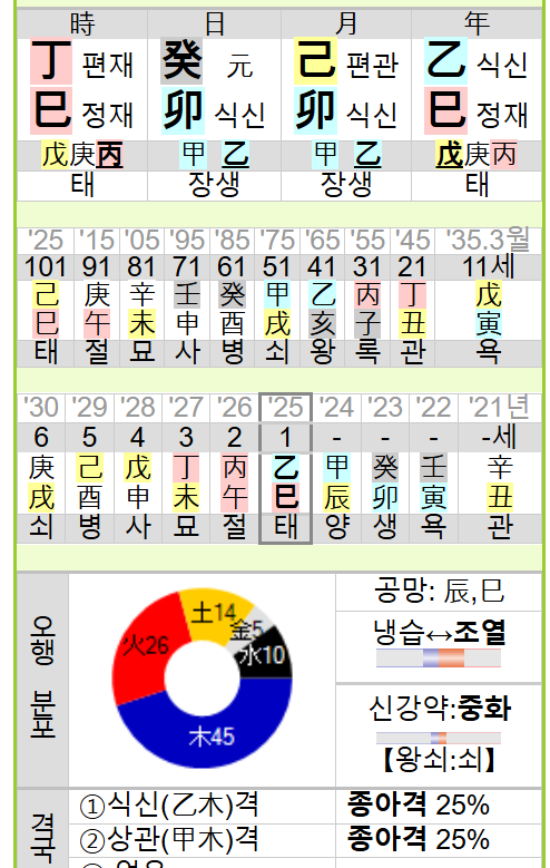 4월 4일 만세력이다. 을사년 기묘월 계묘일 정사시...푸른 초월에 흐리고 비가 내리는 형국 다만 시지의 정화가 계수와 충하니 내리는 비의 위력은 반감된다.