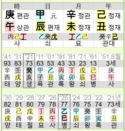 갑목이고, 진토 아래 을목이 갑목에 힘을 보탠다. 더운 미월생인데 더운날에는 수분이 필수다. 미토의 정화가 갈증을 느낄 정도로 덥게 느껴지지만 진토 아래에 계수가 있으니 나름대로 좋다.